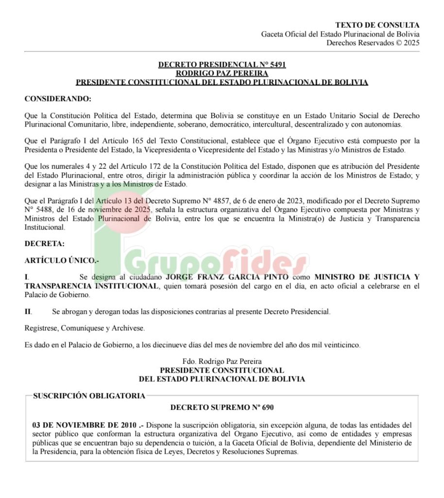 El Gobierno nombró en las últimas horas a Jorge Franz García Pinto como nuevo ministro de Justicia y Transparencia Institucional, tras confirmarse que Freddy Vidovic tiene una sentencia ejecutoriada. El presidente Rodrigo Paz Pereira emitió el Decreto Supremo 5491 con el que se oficializa la destitución de Vidovic y el nombramiento de García Pinto, quien la semana pasada había sido posesionado como viceministro de Régimen Interior y Policía.