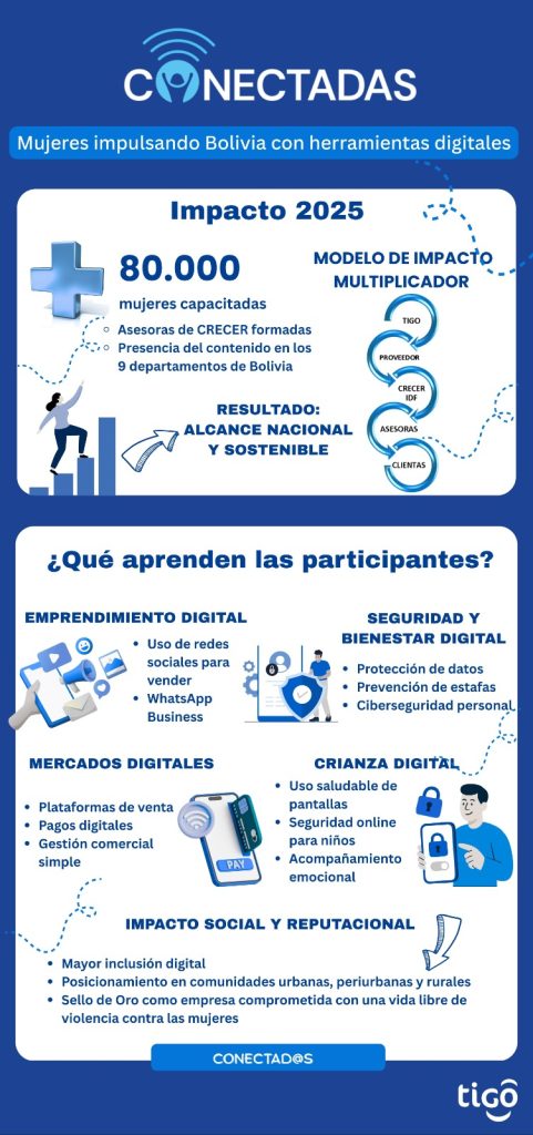 Tigo Bolivia cierra el 2025 consolidando su compromiso con la construcción de un ecosistema digital inclusivo, seguro y sostenible. A través de sus programas de Responsabilidad Social Corporativa, Conéctate Segur@ y Conectadas, la compañía logró capacitar a más de 112.000 personas en todo el país, fortaleciendo habilidades digitales esenciales para estudiantes, familias, docentes, emprendedoras y empresas.