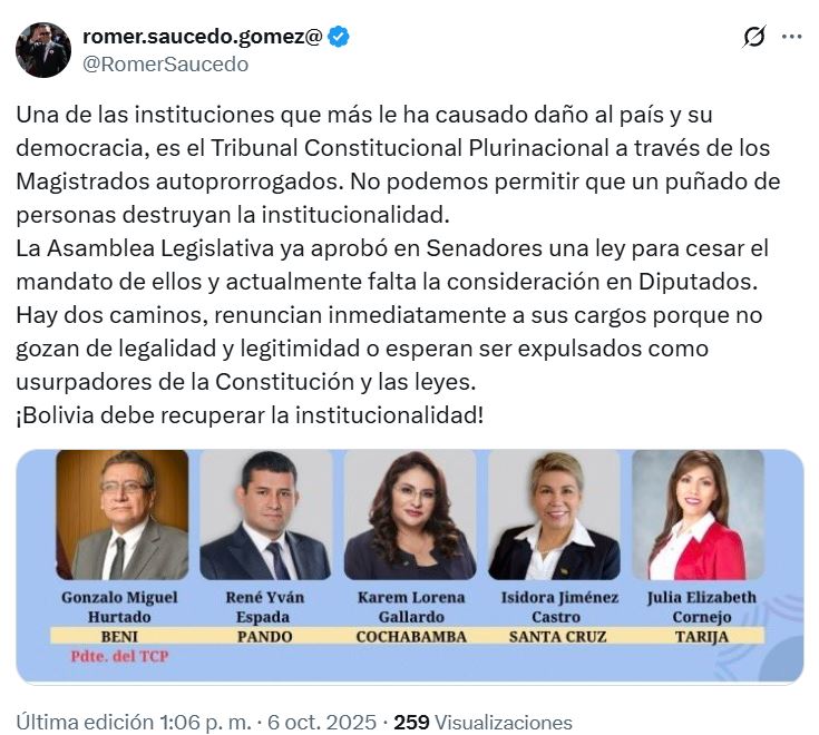 “El Tribunal Constitucional Plurinacional, a través de los magistrados autoprorrogados, es una de las instituciones que más daño causó al país y su democracia. La Asamblea Legislativa ya aprobó en Senadores una ley para cesar su mandato, y actualmente falta la consideración en Diputados. Se plantean dos caminos: renuncian inmediatamente a sus cargos o esperan ser expulsados como usurpadores de la Constitución Política del Estado y las leyes”, sostuvo.