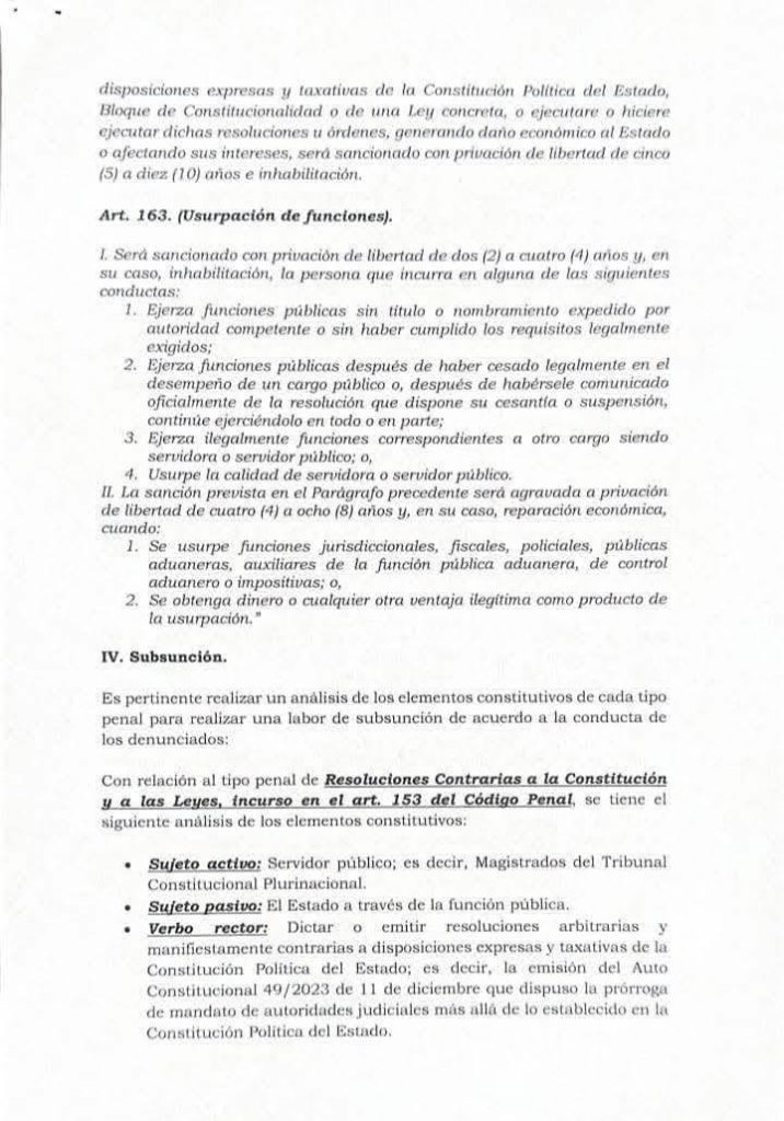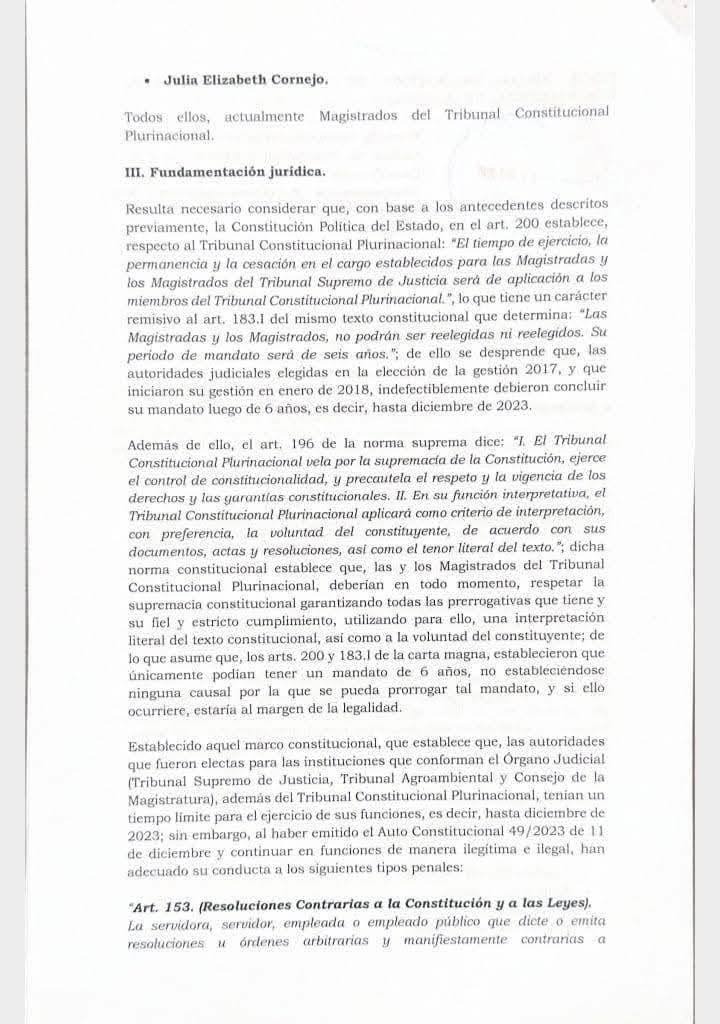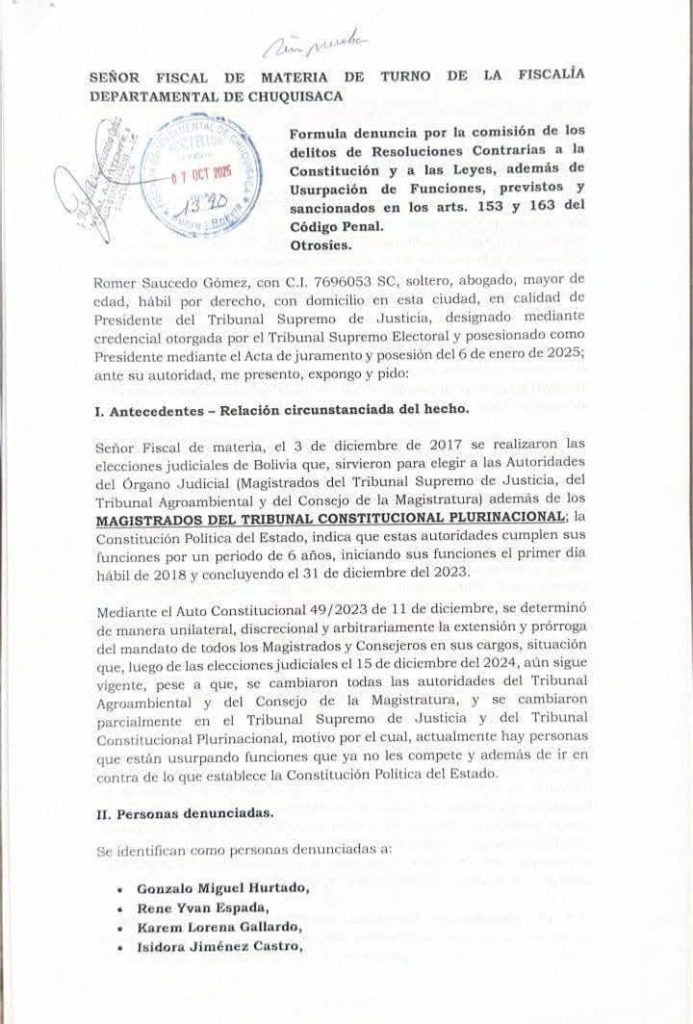 El presidente del Tribunal Supremo de Justicia, Romer Saucedo Gómez, presentó este martes una denuncia penal ante la Fiscalía Departamental de Chuquisaca contra los cinco magistrados autoprorrogados del Tribunal Constitucional Plurinacional, por los presuntos delitos de resoluciones contrarias a la Constitución y usurpación de funciones.